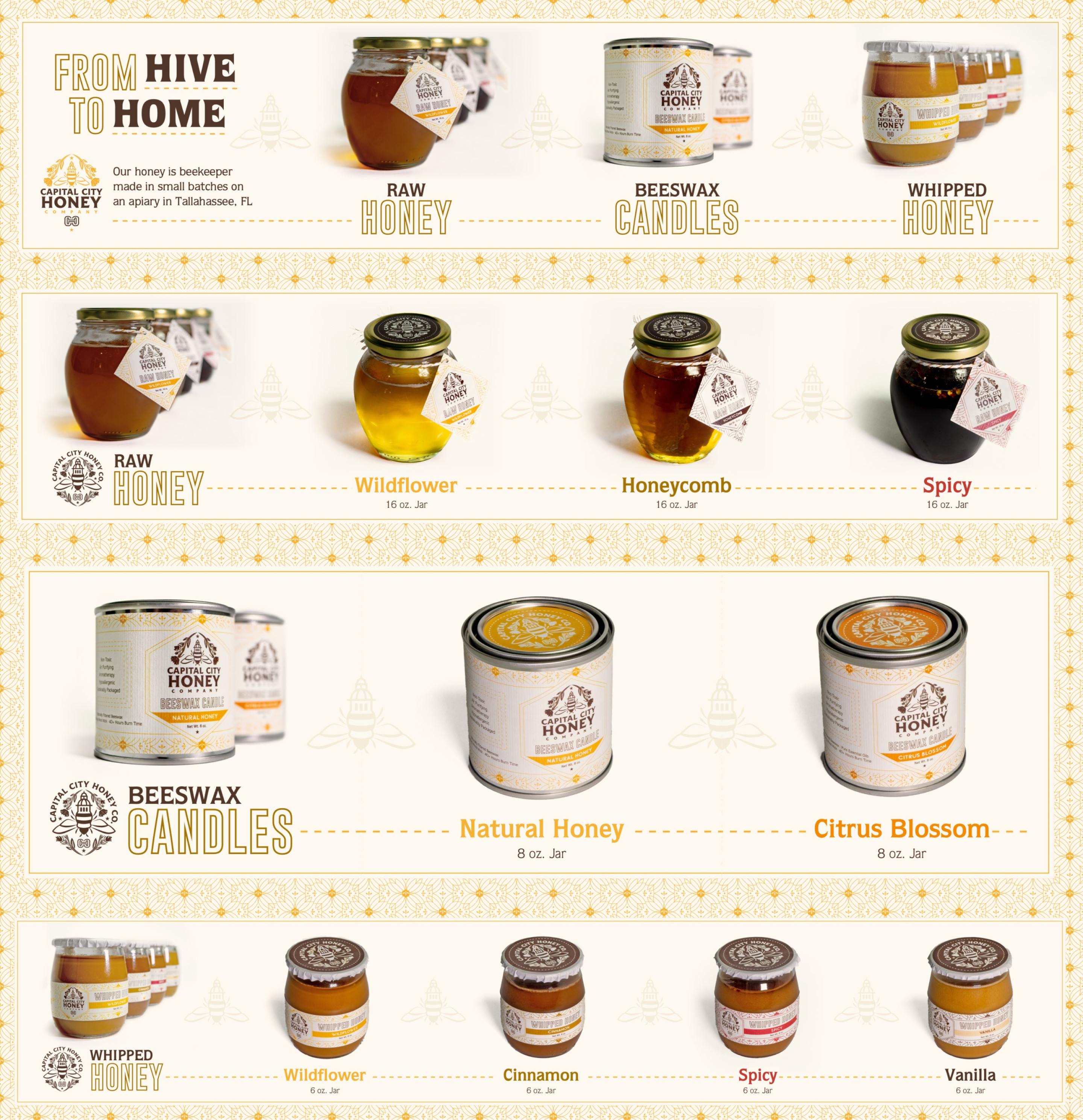 We started with a logo mark and packaging design using simple bold colors, paired with a line-driven illustrated seamless pattern unique to the brand. The anchor of the brand identity is a logo mark with type that allows usage for various packaging needs. The mark features a nod to the Tallahassee capitol building fused with a honey bee along with rustic illustrations of various wild flowers commonly pollinated by honey bees.