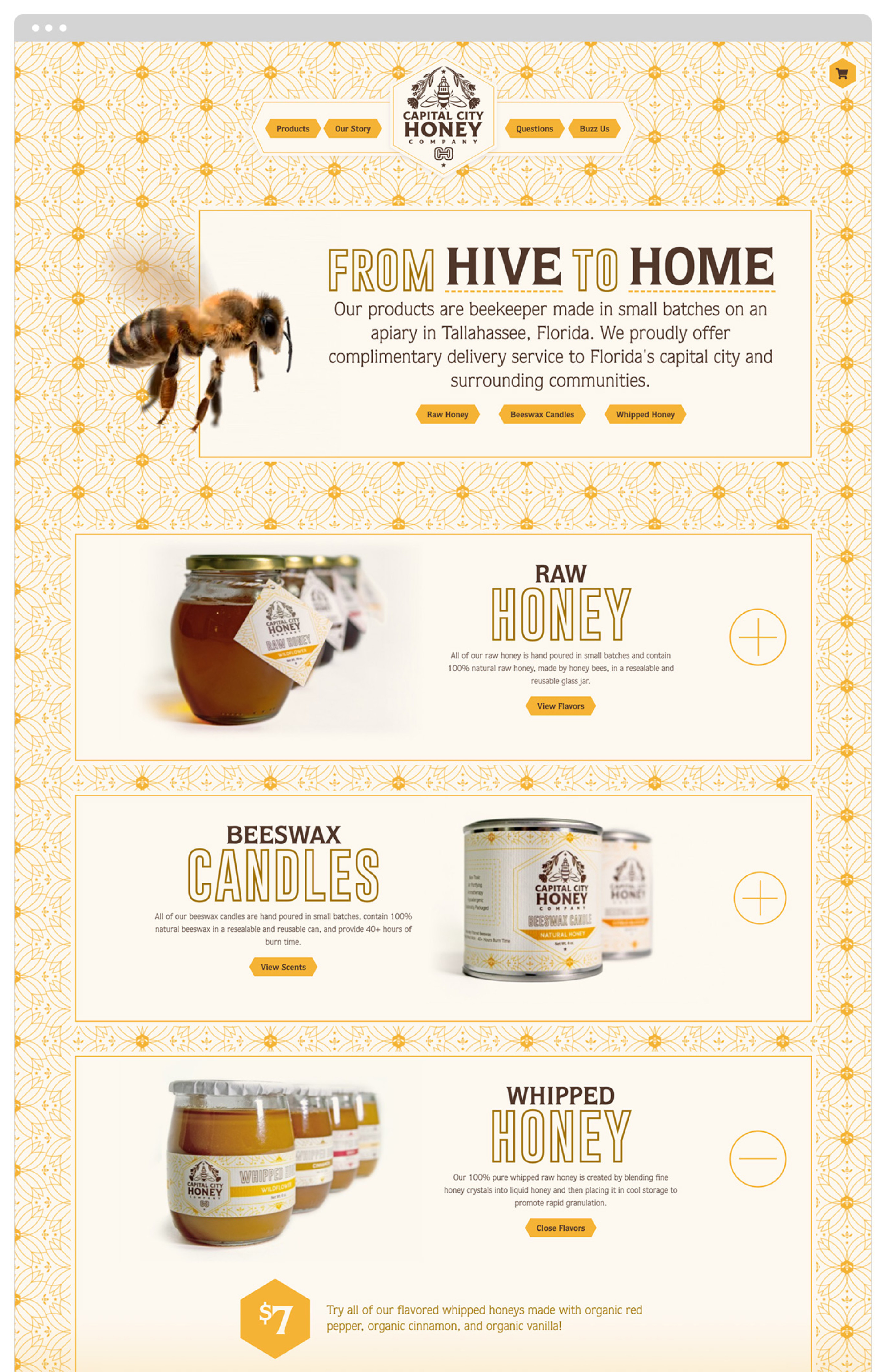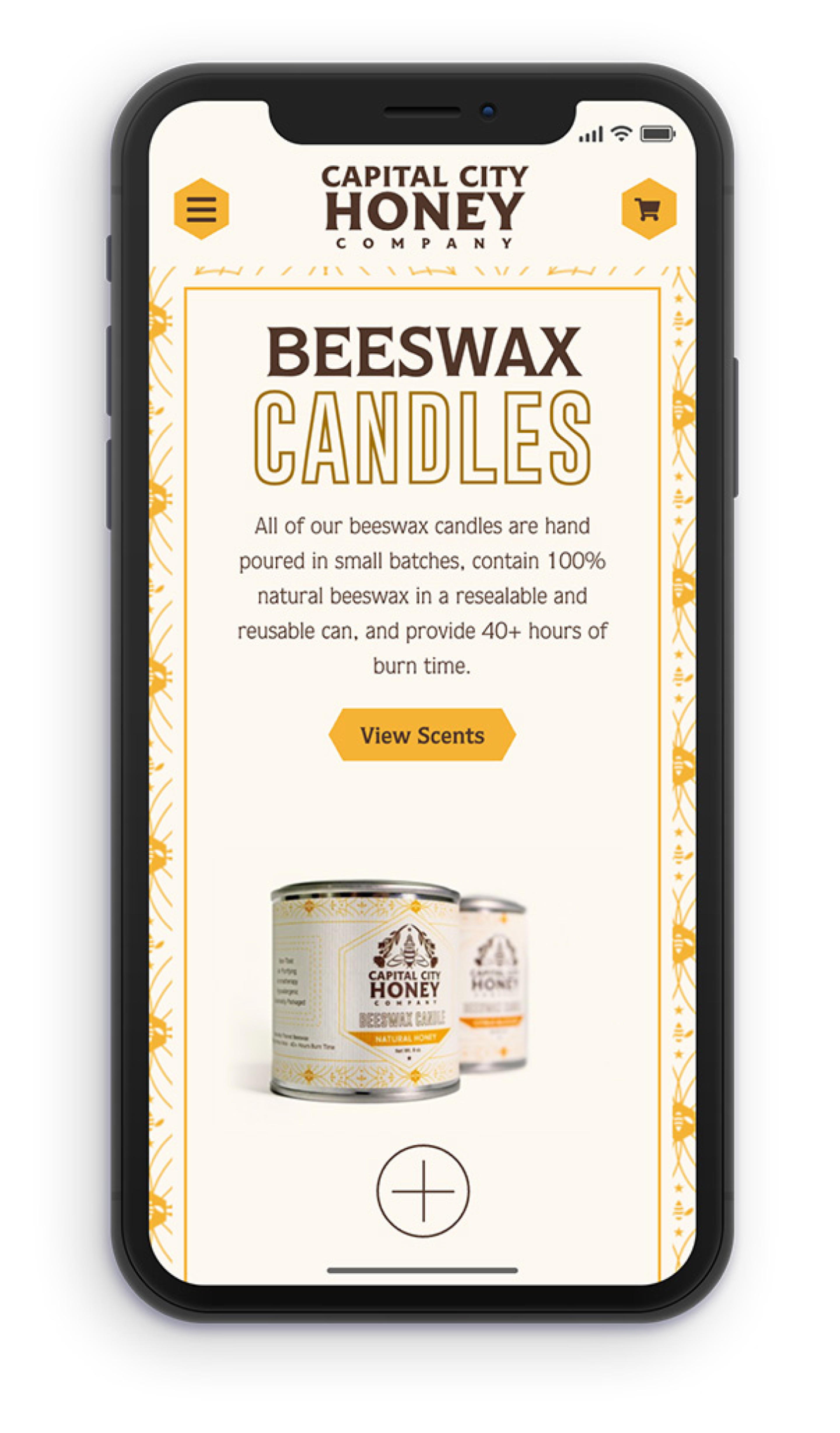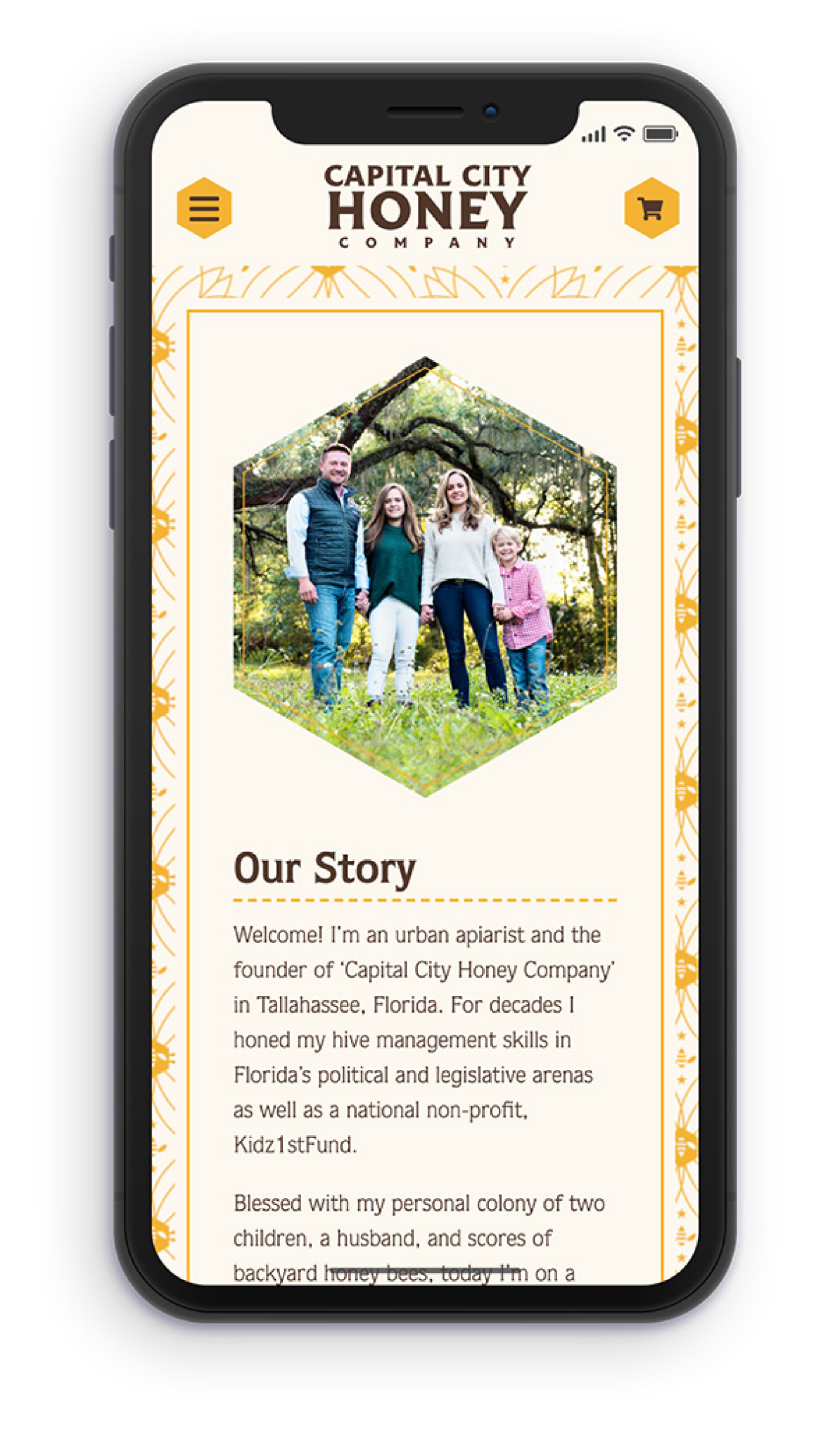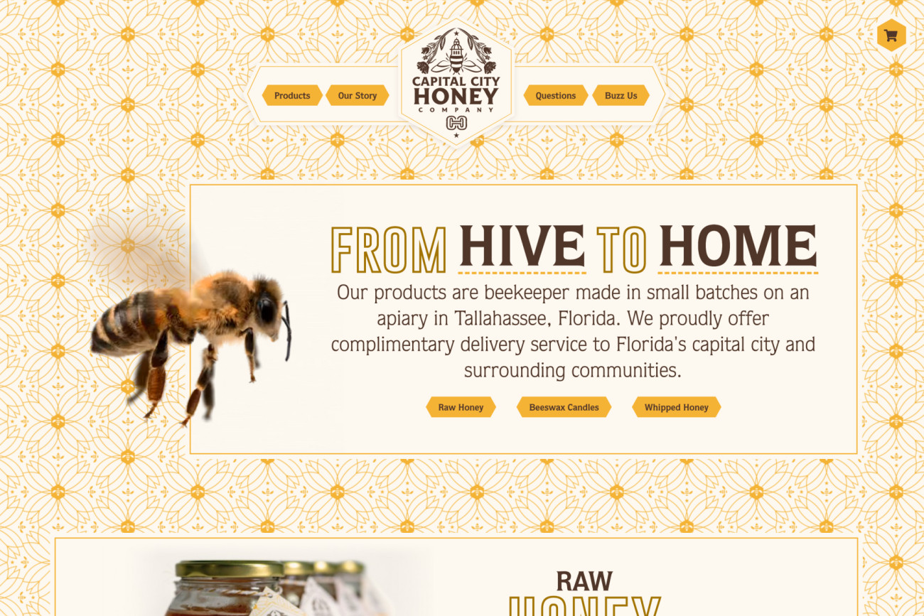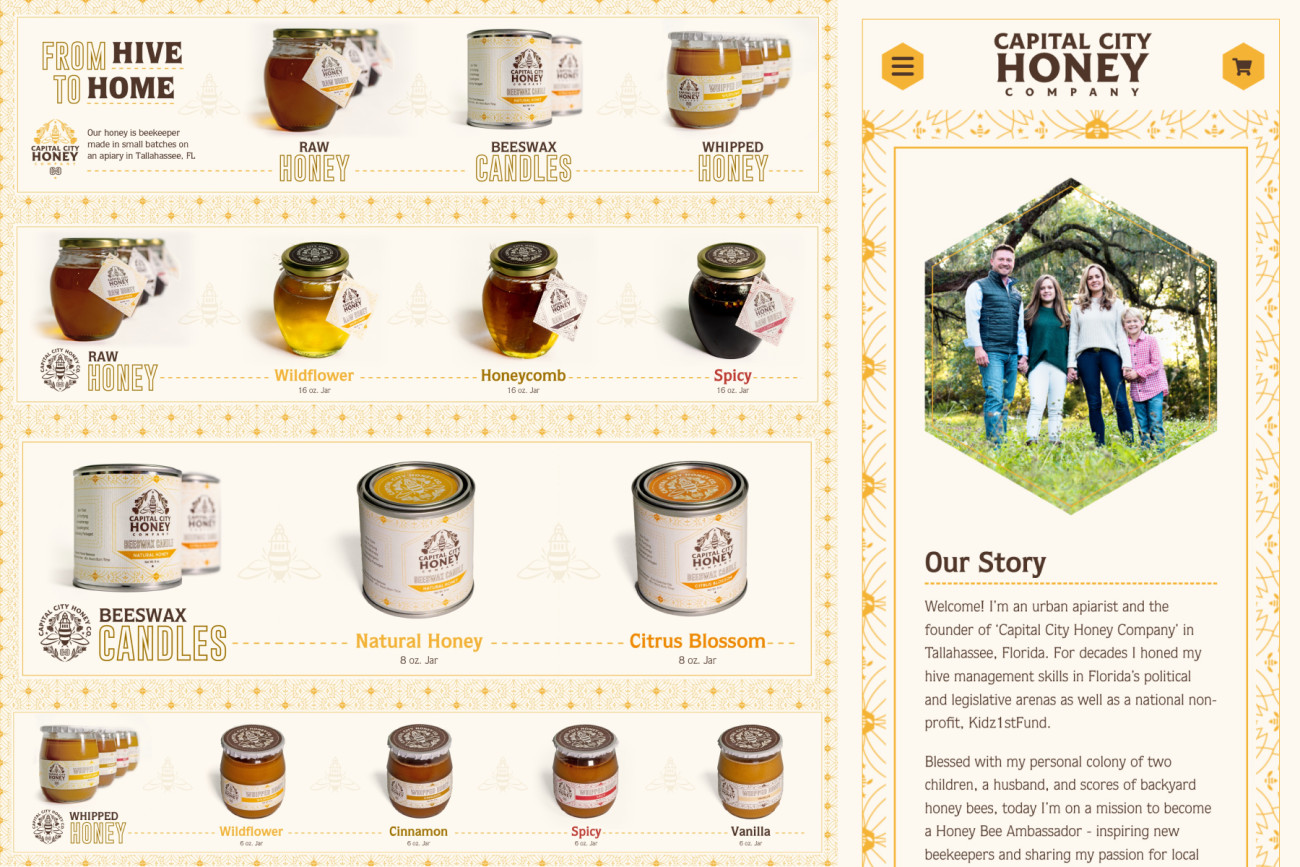 The Capital City Honey Company website not only extends the brand design digitally with familiar design elements (check out the flying bee animation!), it also includes a simplified integration with the client's PayPal account. The content management system (CMS) allows the management of supply links for when products are out of stock or not in harvest. The CMS also allows the management of various other product listings as the business grows its inventory.
