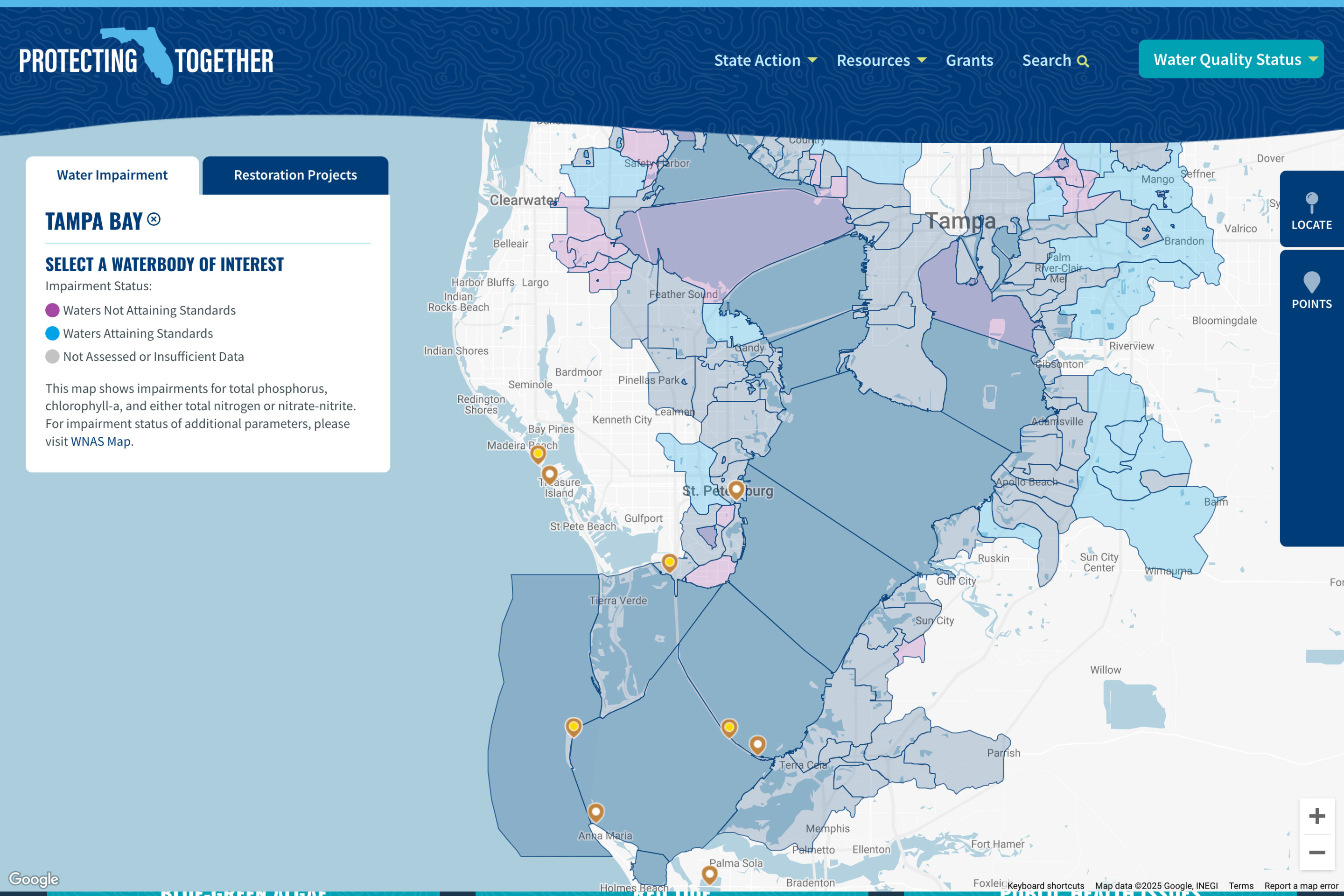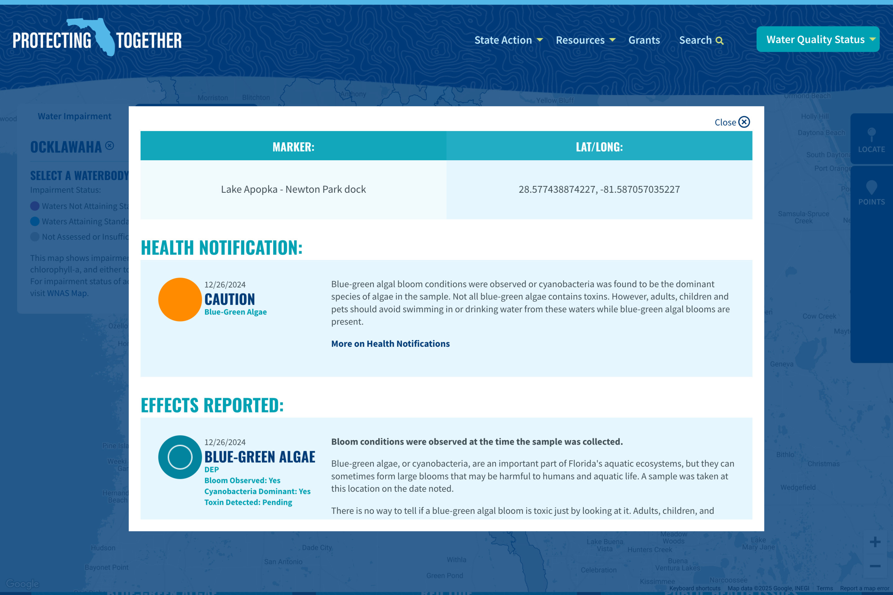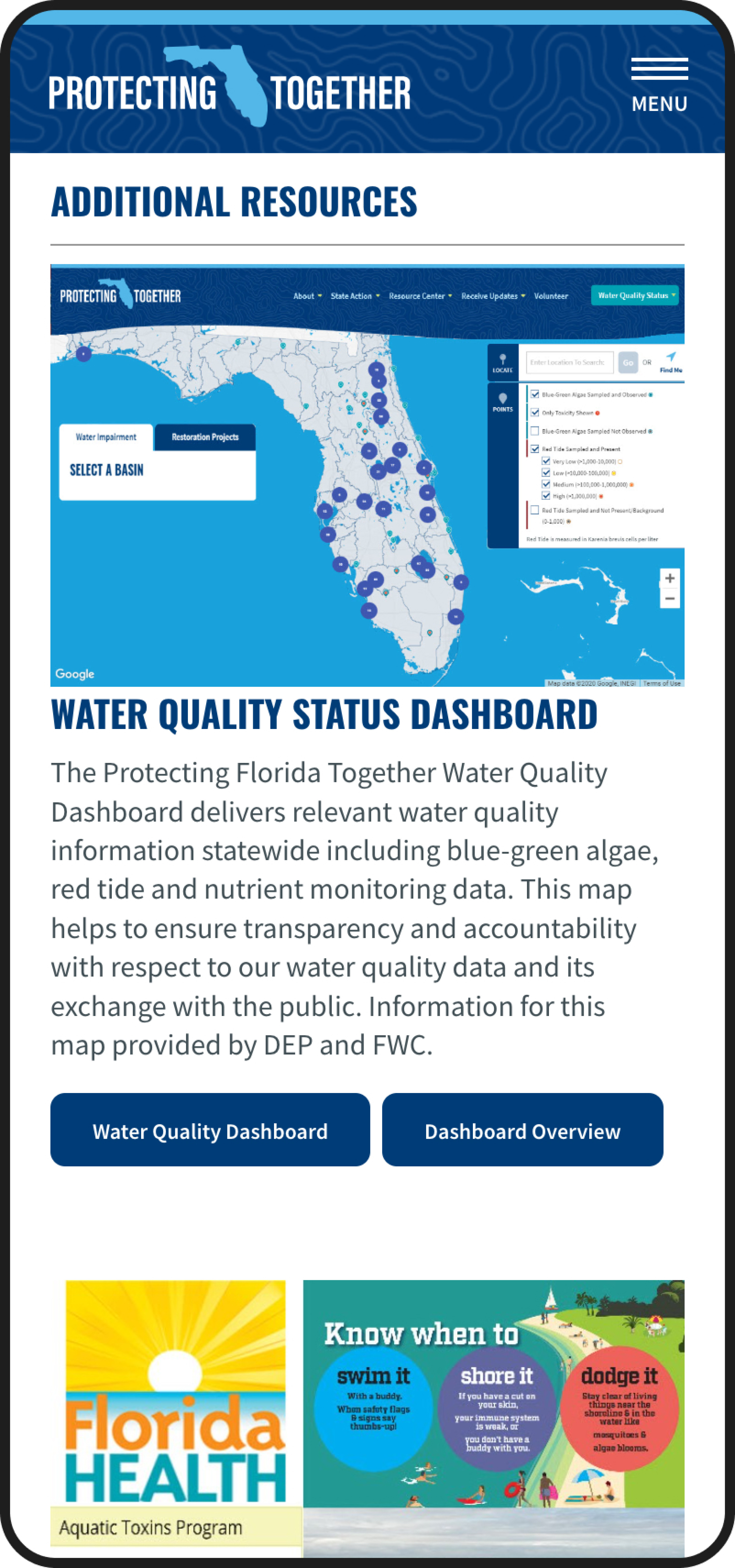 The water equality map was designed and built leveraging the Google Maps API. Layering in and displaying complex data provided by The Florida Department of Environment Protection, the interactive map allows visitors to navigate the state of Florida at various levels of zoom to view area water quality status, waterbody nutrient trends, restoration projects, harmful blue-green algae detections, red tide detections, and other environmental issues of concern anywhere in the state of Florida.