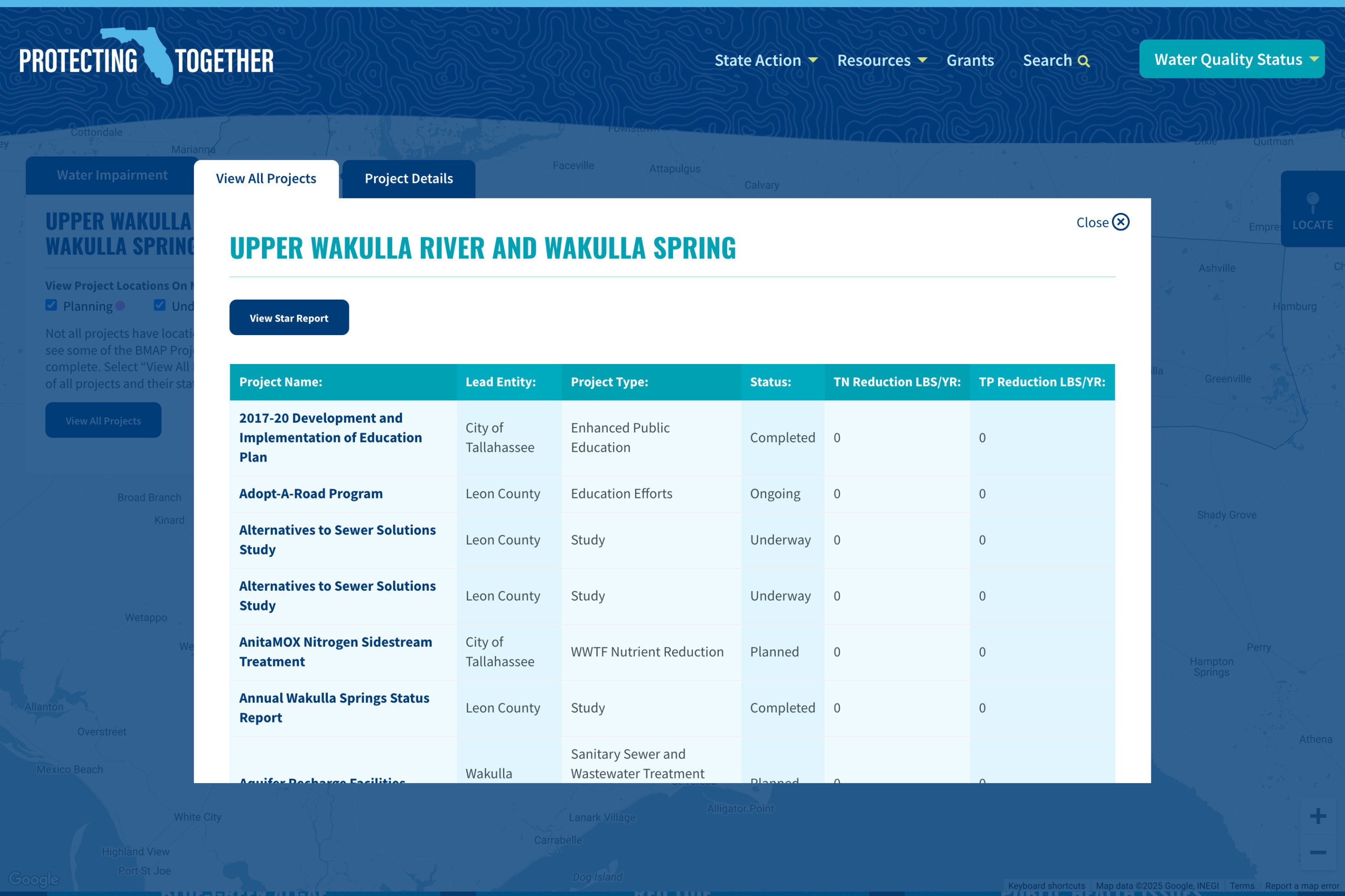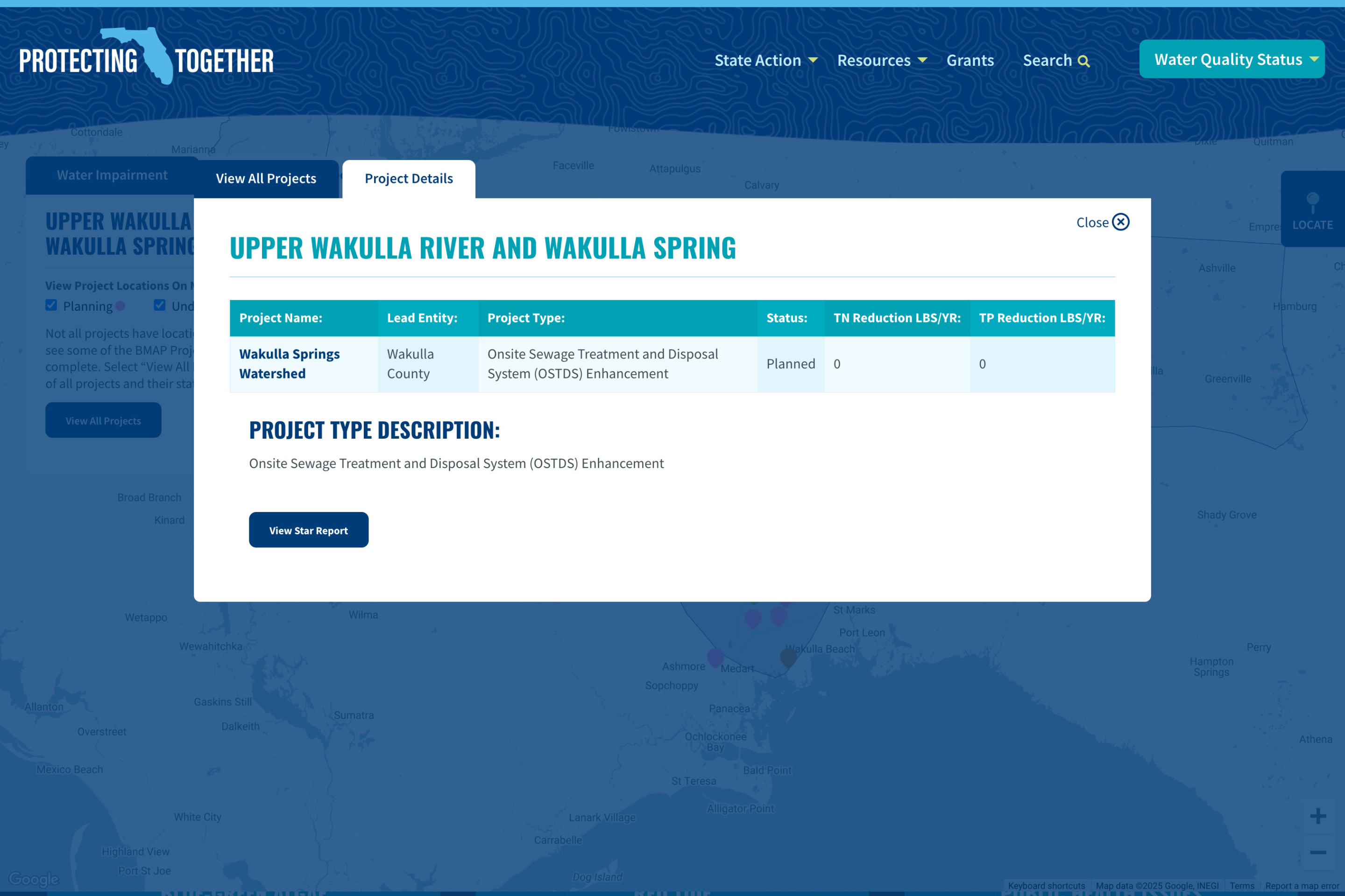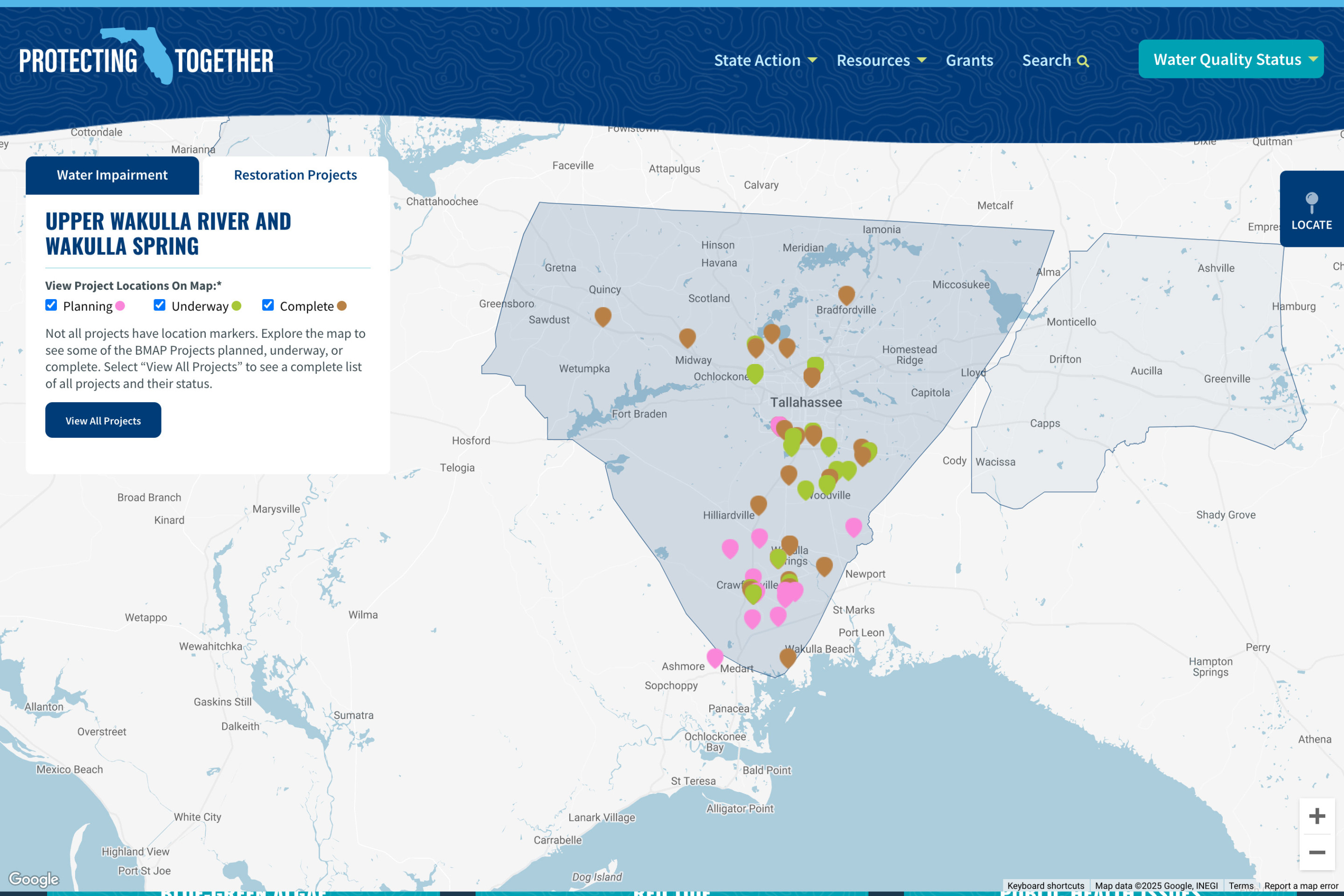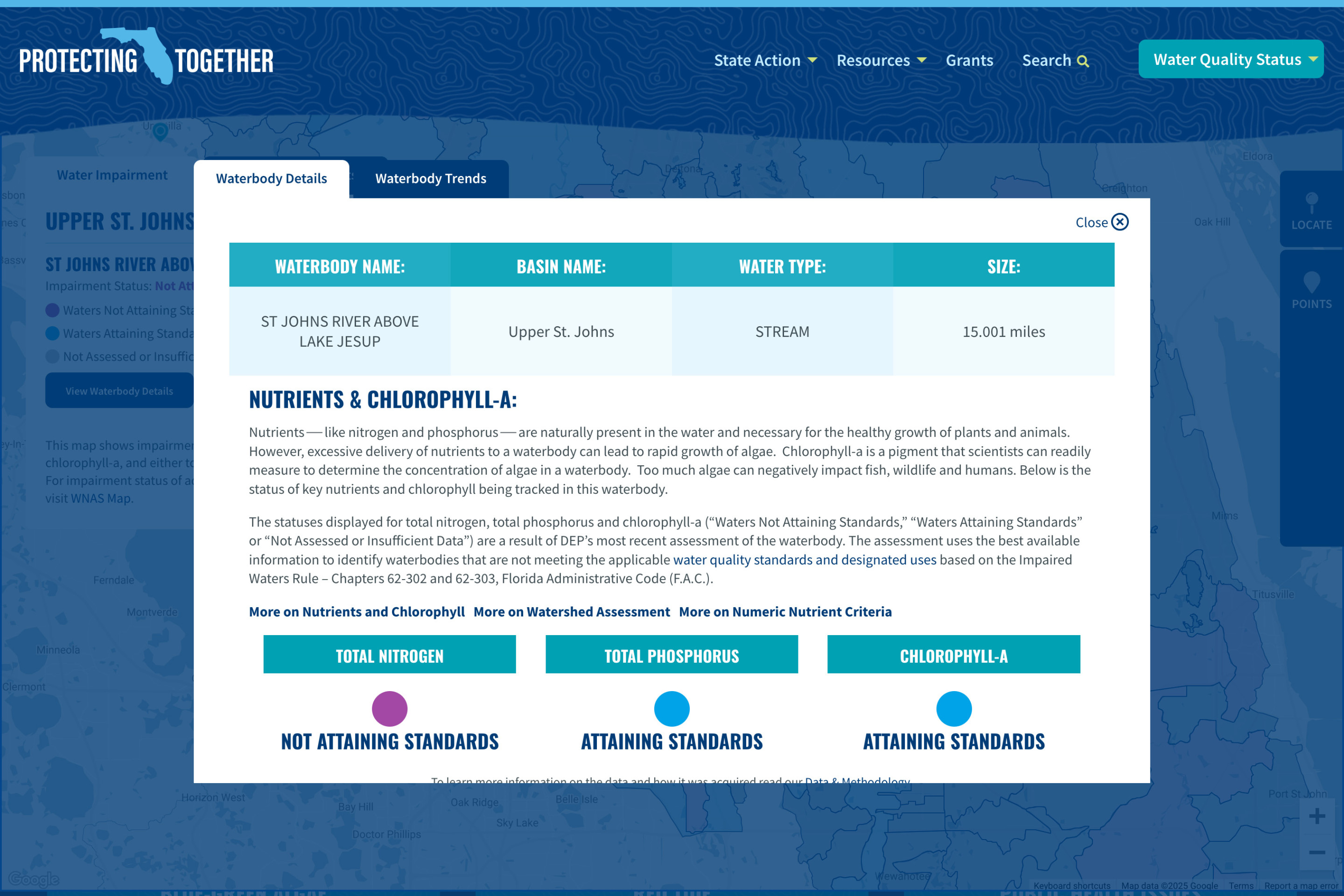 The water equality map was designed and built leveraging the Google Maps API. Layering in and displaying complex data provided by The Florida Department of Environment Protection, the interactive map allows visitors to navigate the state of Florida at various levels of zoom to view area water quality status, waterbody nutrient trends, restoration projects, harmful blue-green algae detections, red tide detections, and other environmental issues of concern anywhere in the state of Florida.