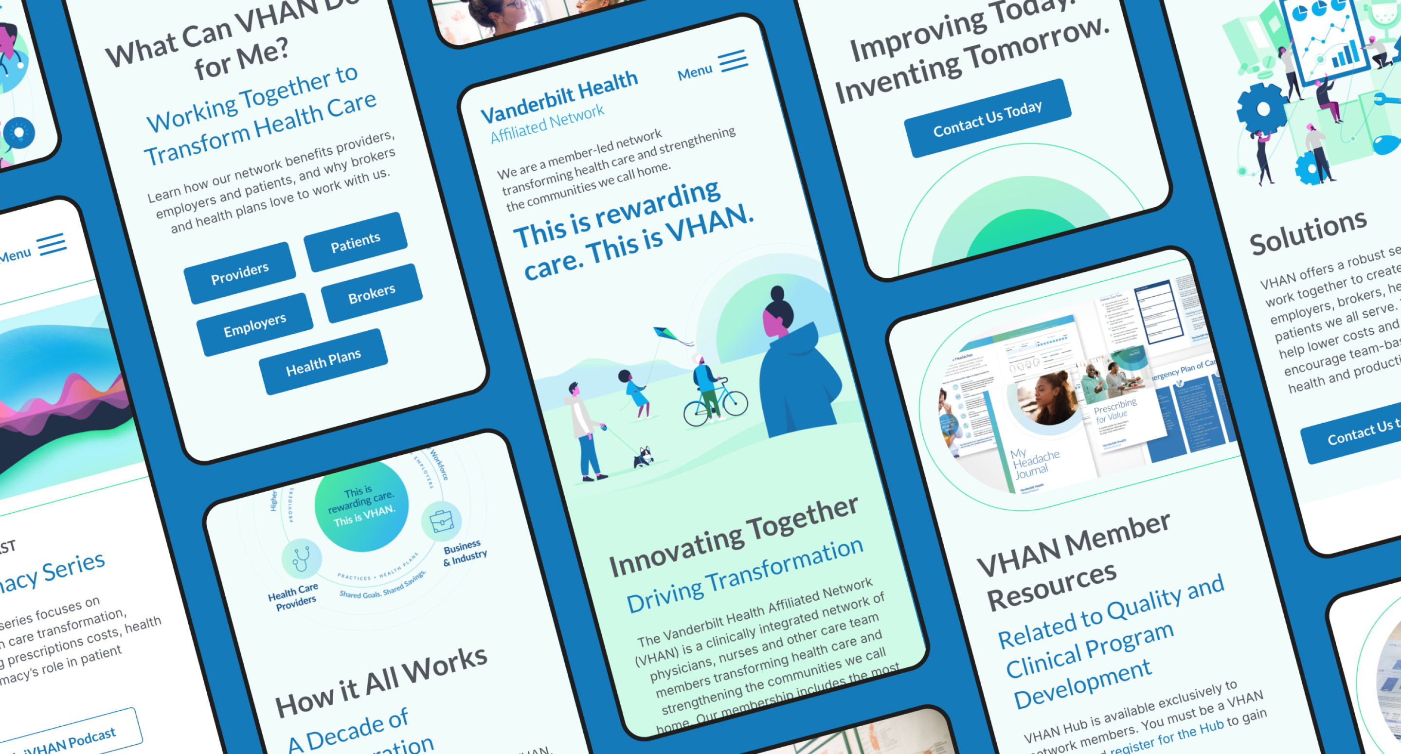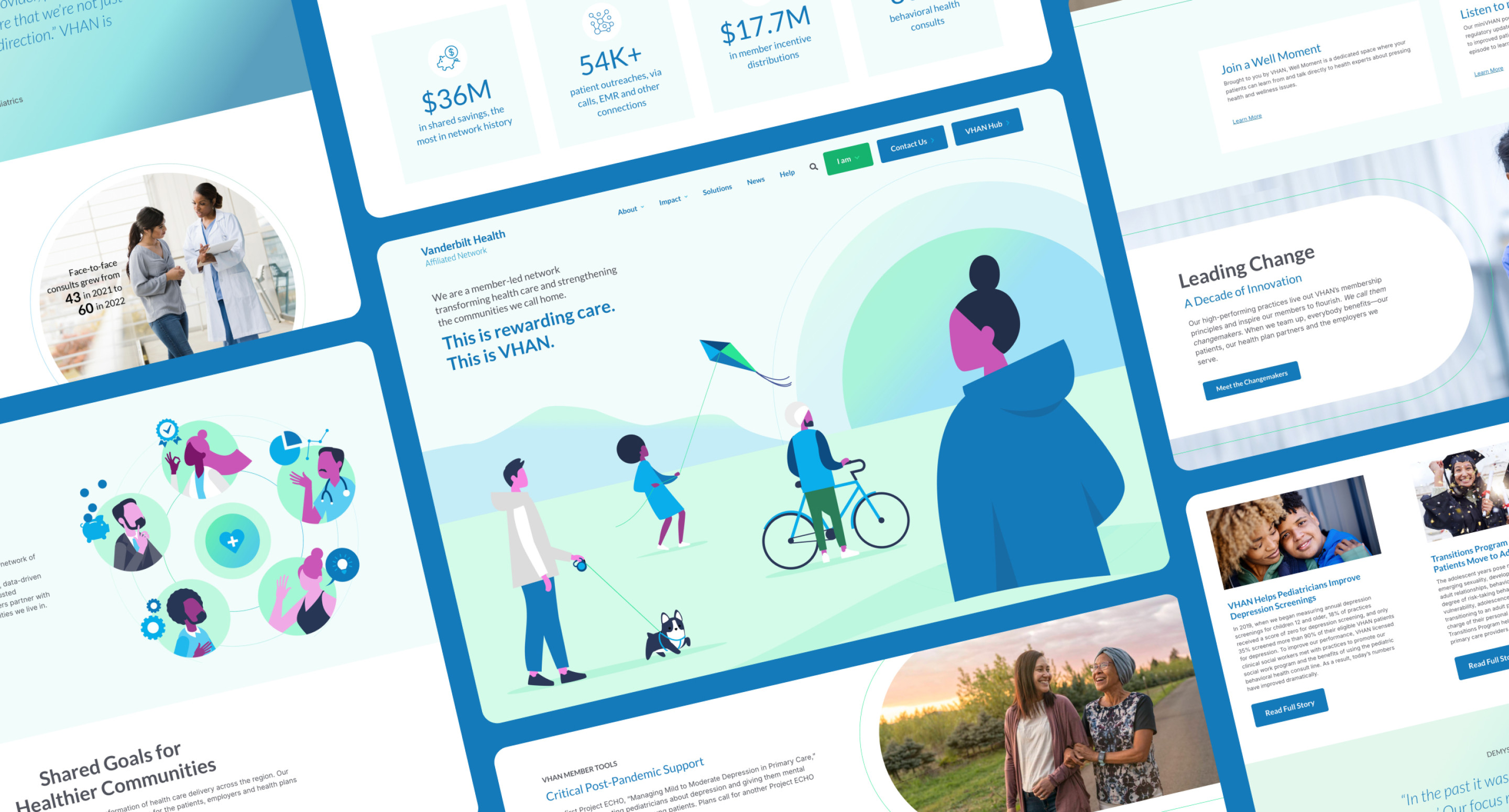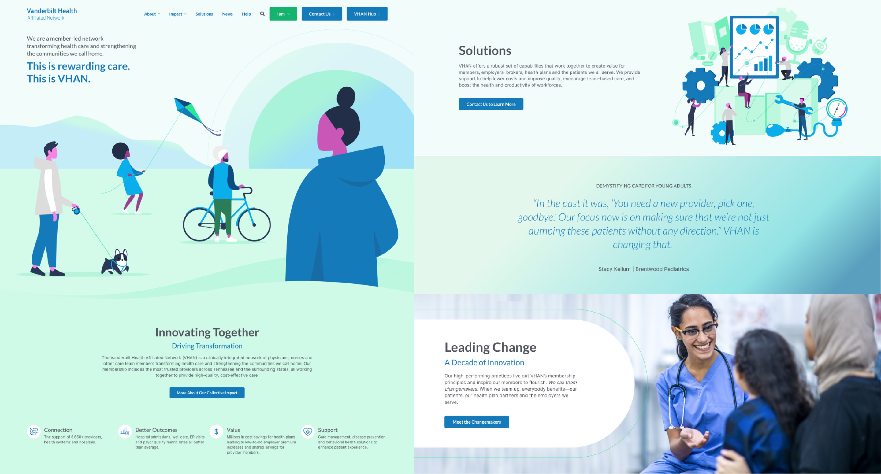 The VHAN website serves as the digital hub for the Vanderbilt Health Affiliated Network, designed to seamlessly connect healthcare professionals, patients, and partners. Working in sync with the VHAN internal team to plan and design the overall direction, our team prioritized creating a user-friendly, responsive platform with streamlined navigation. Through a clean, modern design with emphasis on a mix of inclusive illustrations and people-focused photography, we showcase VHAN’s commitment to delivering high-quality, collaborative care. Integrated tools, dynamic content, and intuitive layouts ensure users can easily access resources, explore services, and stay informed about VHAN’s mission to transform healthcare through innovation and connection.